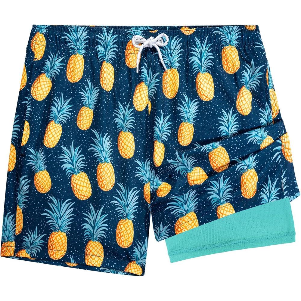 BRISIRA Mens Swim Trunks 5 Inch Compression Liner Beach Swim Shorts Bathing Suit Quick Dry 4-Way Stretch Pockets(Deepblue Pineaple)