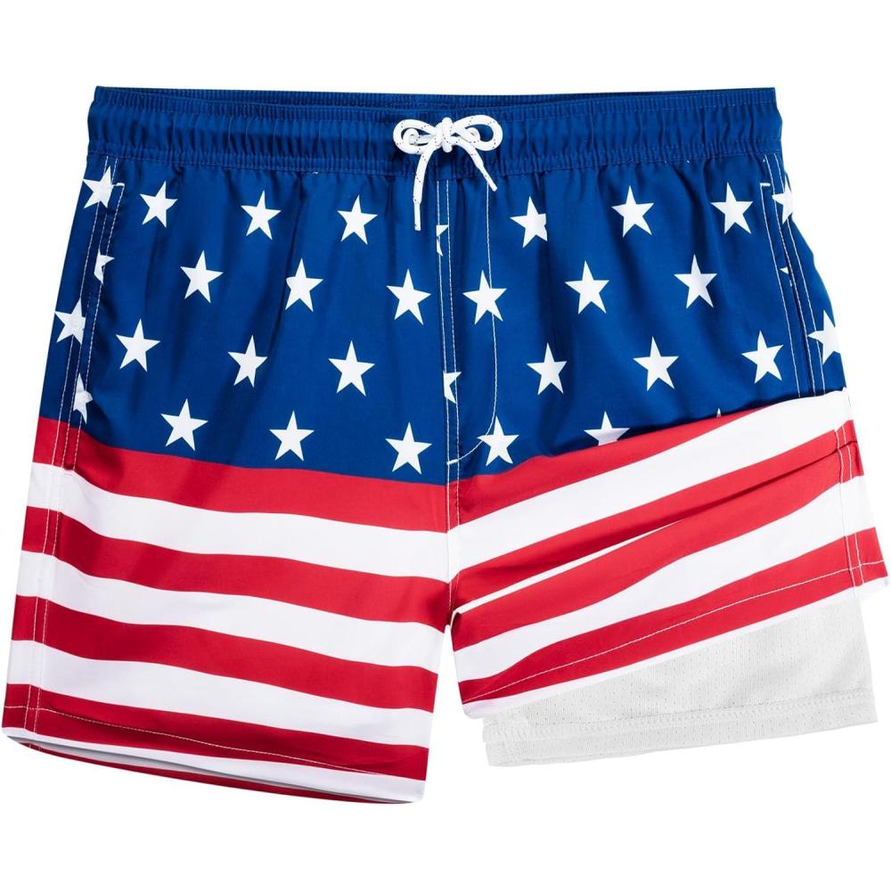 BRISIRA Mens Swim Trunks 5 Inch Compression Liner Beach Swim Shorts Bathing Suit Quick Dry 4-Way Stretch Pockets(Usa Flag)