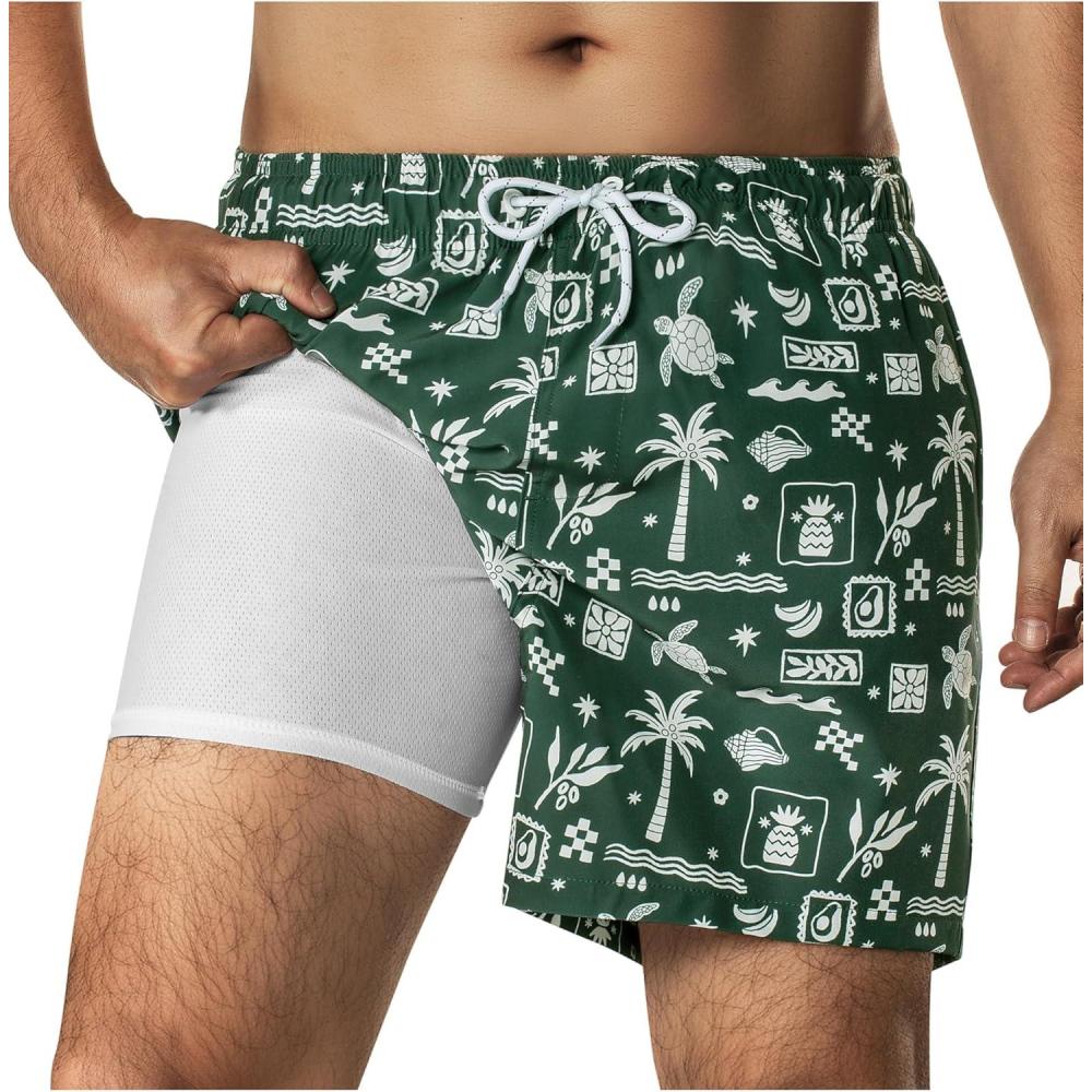 BRISIRA Mens Swim Trunks 5 Inch Quick Dry Bathing Suit with Compression Liner Beach Swimsuit Board Shorts Pockets(Green Hawaiian Print)