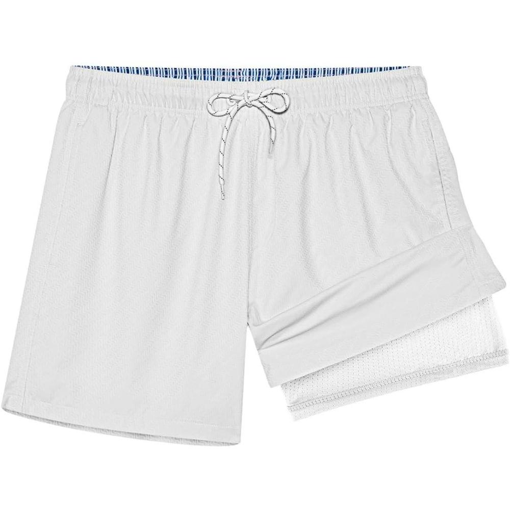 BRISIRA Mens Swim Trunks Ribbed Textured 5" Bathing Suit with Compression Liner Board Shorts Beach Swimsuit Quick Dry Pocket(Whitestripes)