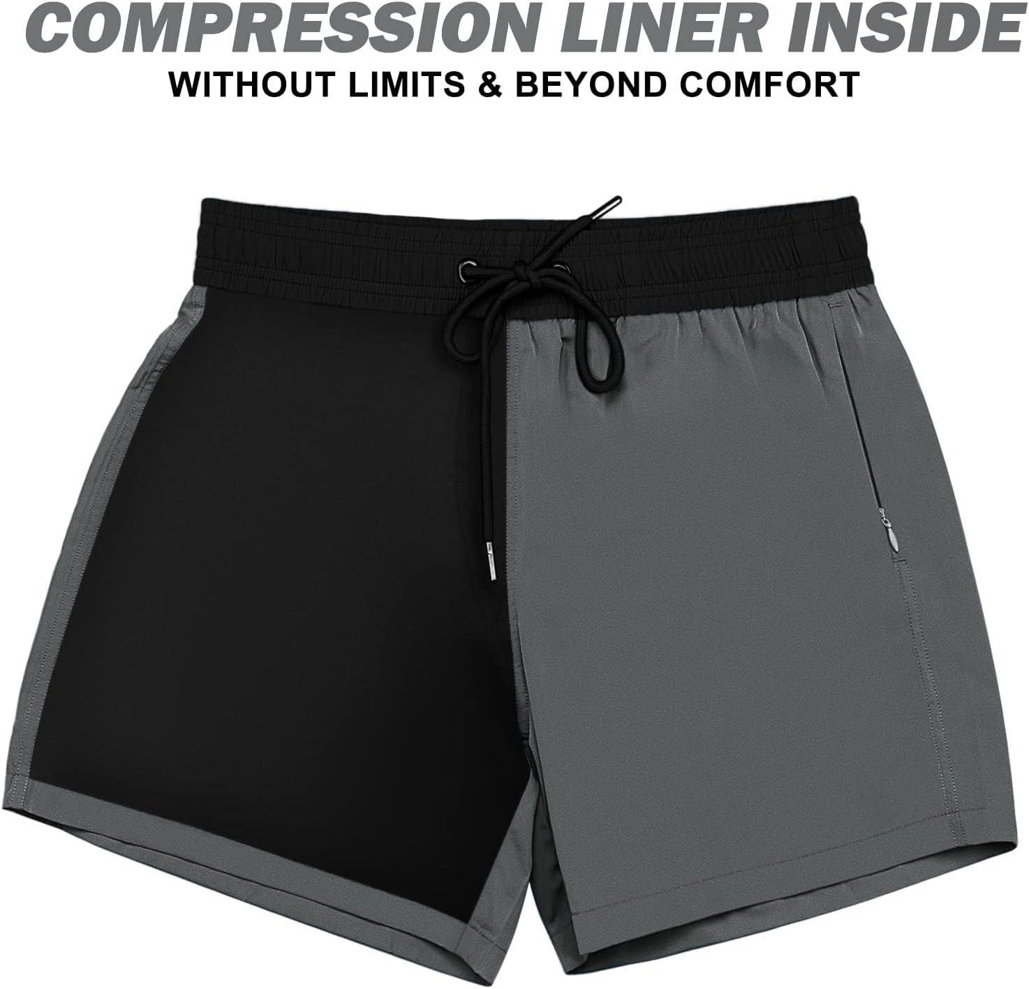 BRISIRA Mens Swim Trunks Swim Shorts Quick Dry 5 inch Inseam Beach Shorts with Compression Liner and Zipper Pocket(Black&grey)