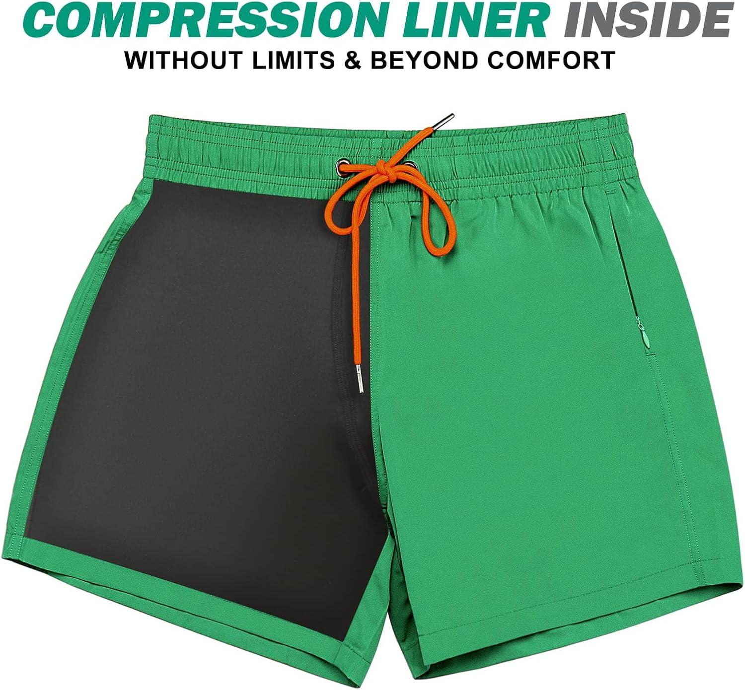 BRISIRA Mens Swim Trunks Swim Shorts Quick Dry 5 inch Inseam Beach Shorts with Compression Liner and Zipper Pocket(Green)