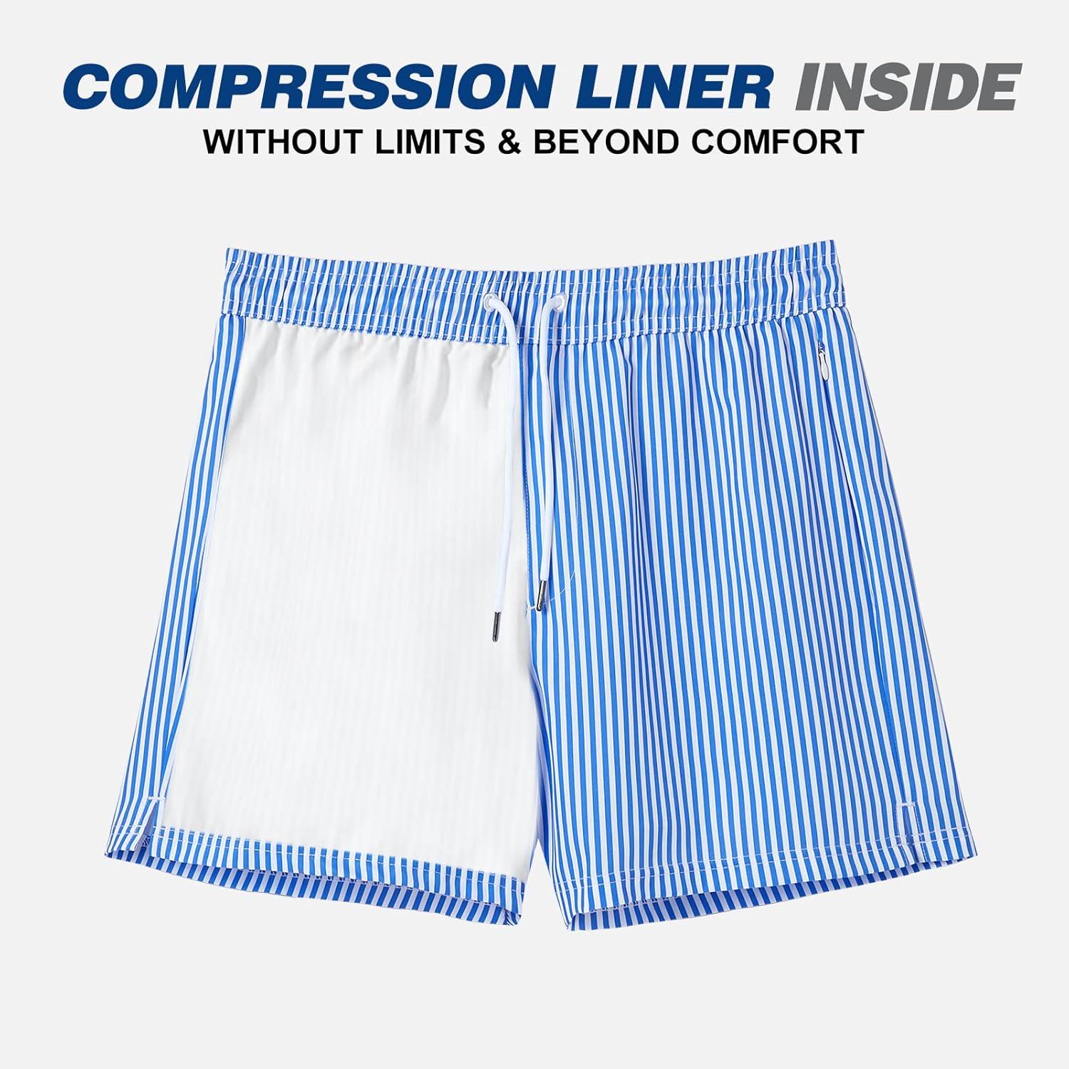 BRISIRA Mens Swim Trunks Swim Shorts Quick Dry 5 inch Inseam Beach Shorts with Compression Liner and Zipper Pocket(Stripeblue&white)