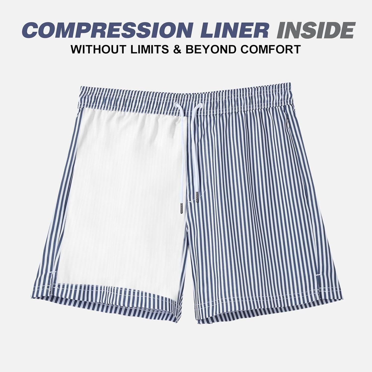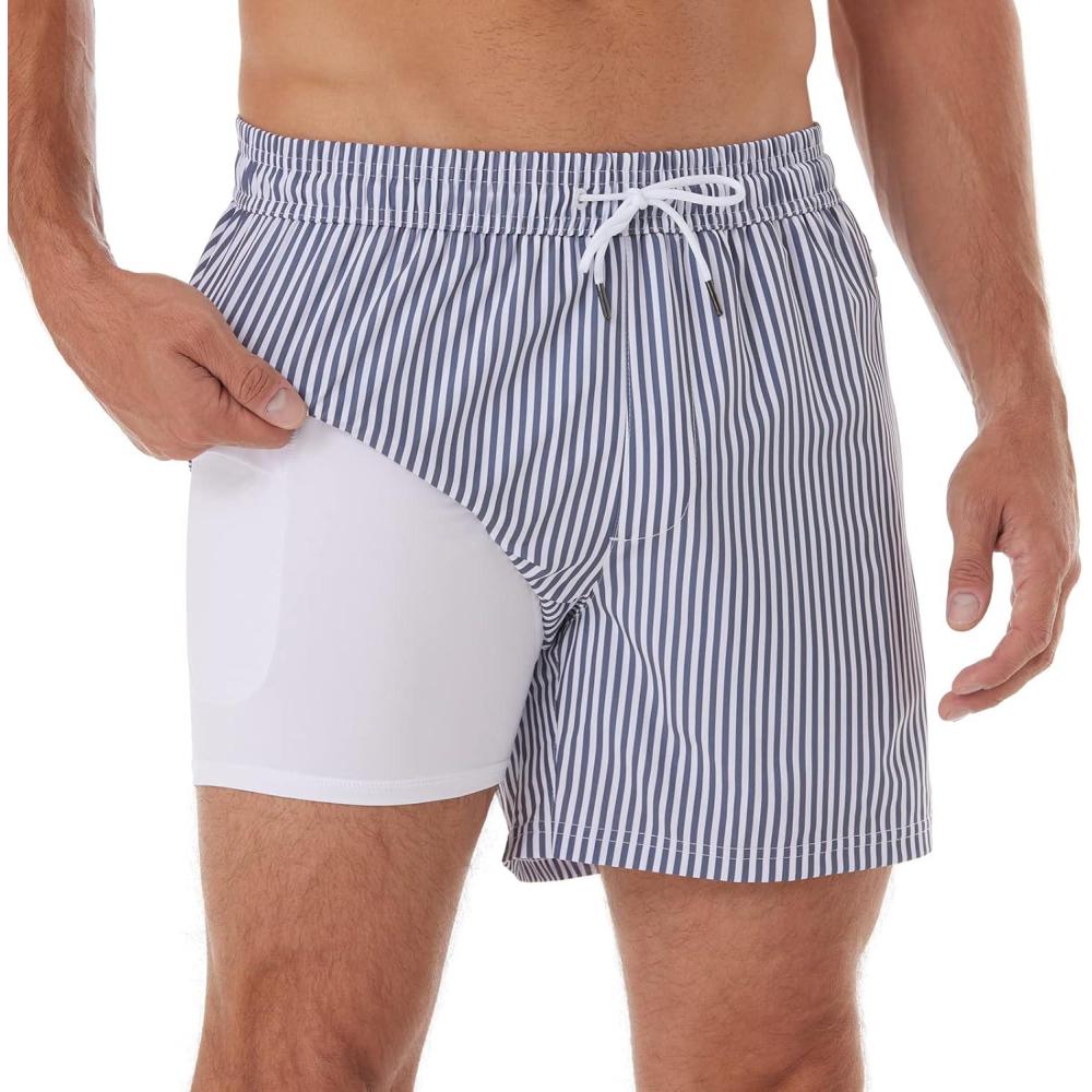 BRISIRA Mens Swim Trunks Swim Shorts Quick Dry 5 inch Inseam Beach Shorts with Compression Liner and Zipper Pocket(Stripedarkblue&white)