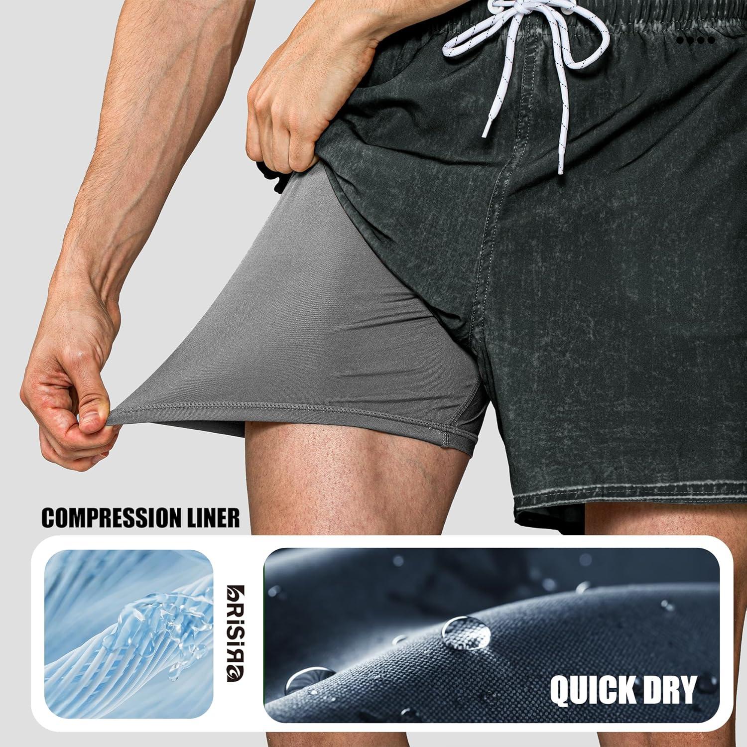 BRISIRA Mens Swim Trunks Washed Look Compression Liner 5 inch Swim Shorts Quick Dry Retro Bathing Suit Lightweight Pocket(Black)