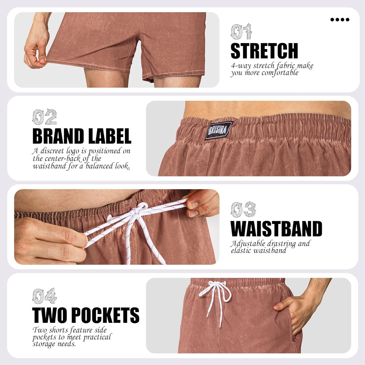BRISIRA Mens Swim Trunks Washed Look Compression Liner 5 inch Swim Shorts Quick Dry Retro Bathing Suit Lightweight Pocket(Brown)