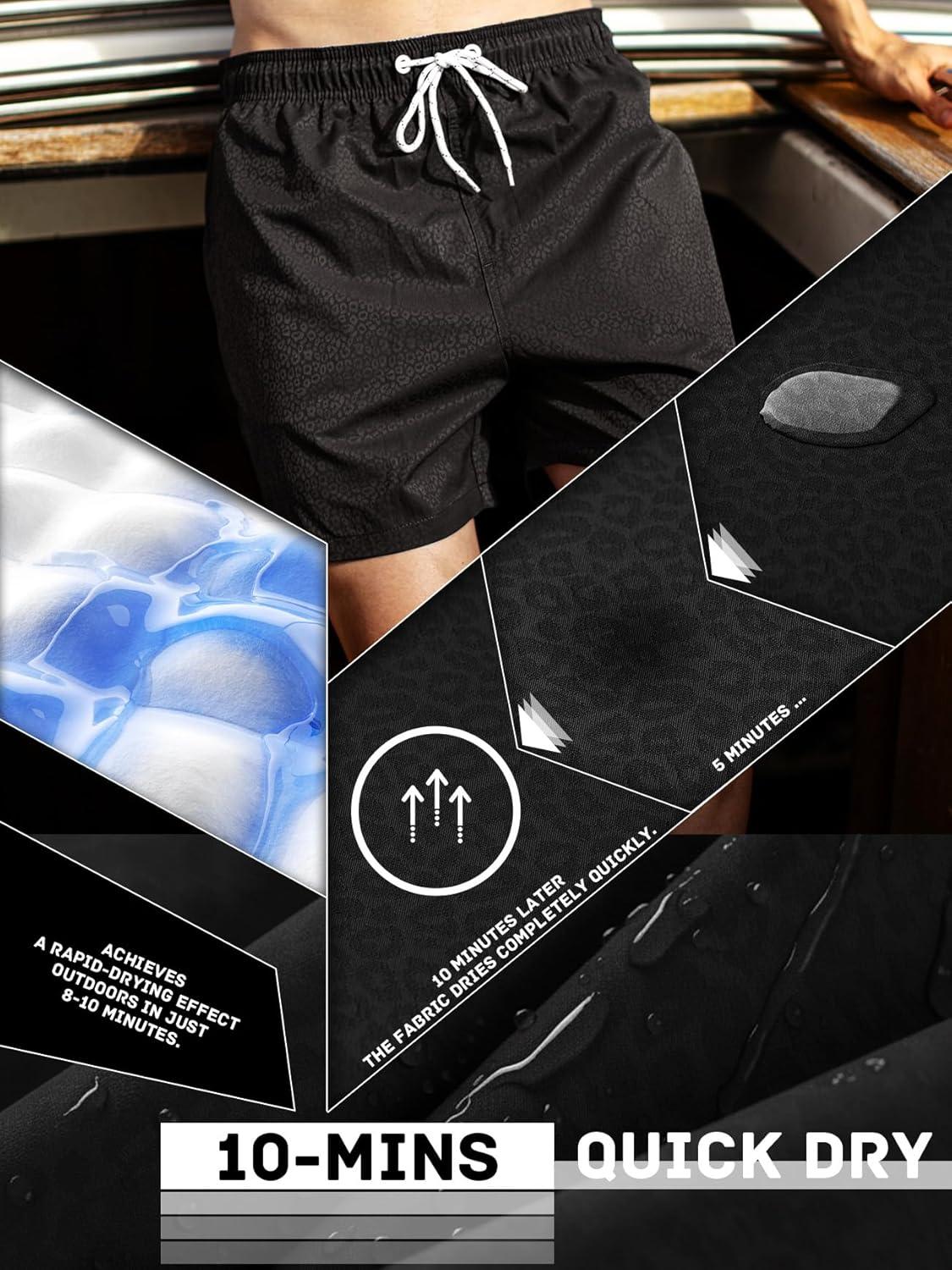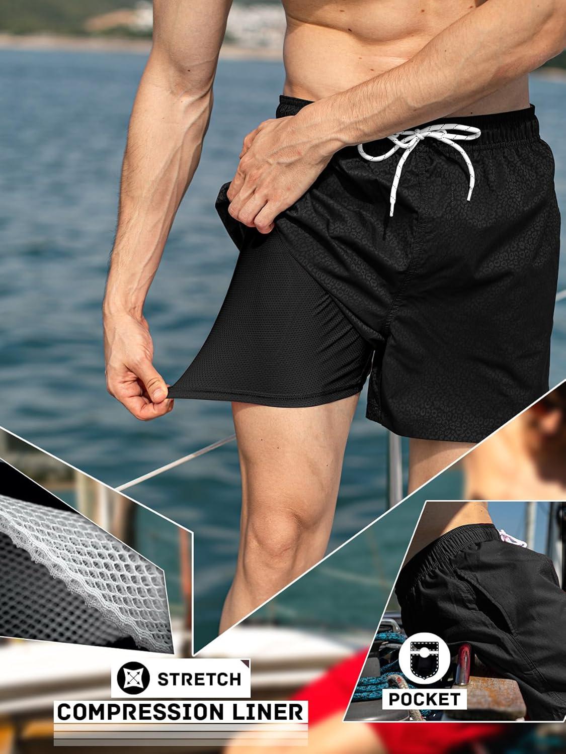 BRISIRA Mens Swim Trunks with Compression Liner 5″ Leopard Print Beach Shorts Quick Dry Board Shorts Water-Resistant Swimsuit(Black Leopard)