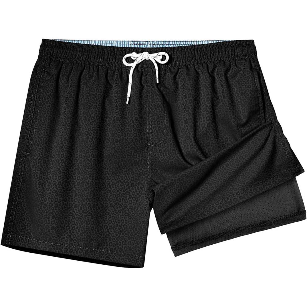 BRISIRA Mens Swim Trunks with Compression Liner 5" Leopard Print Beach Shorts Quick Dry Board Shorts Water-Resistant Swimsuit(Black Leopard)