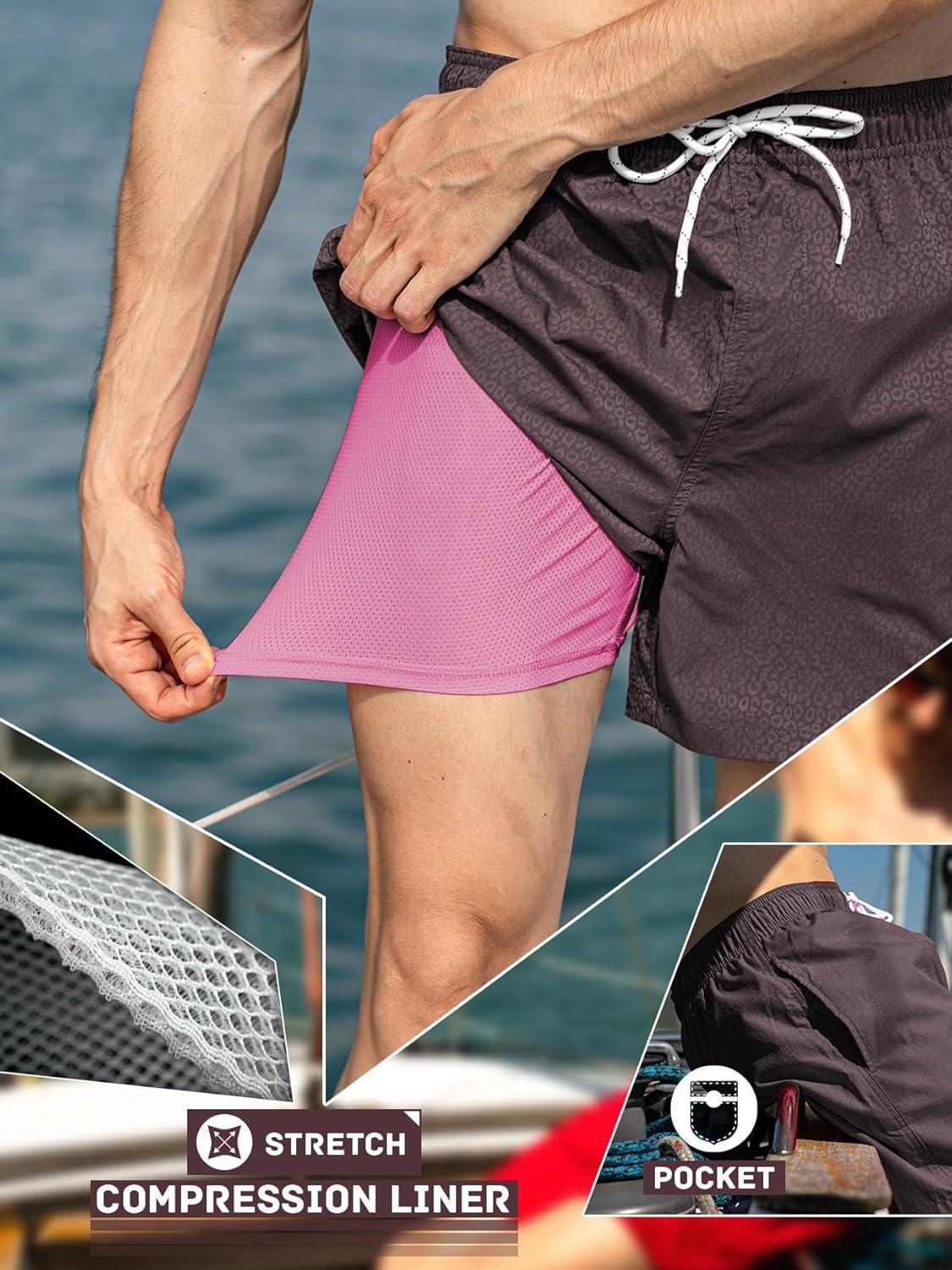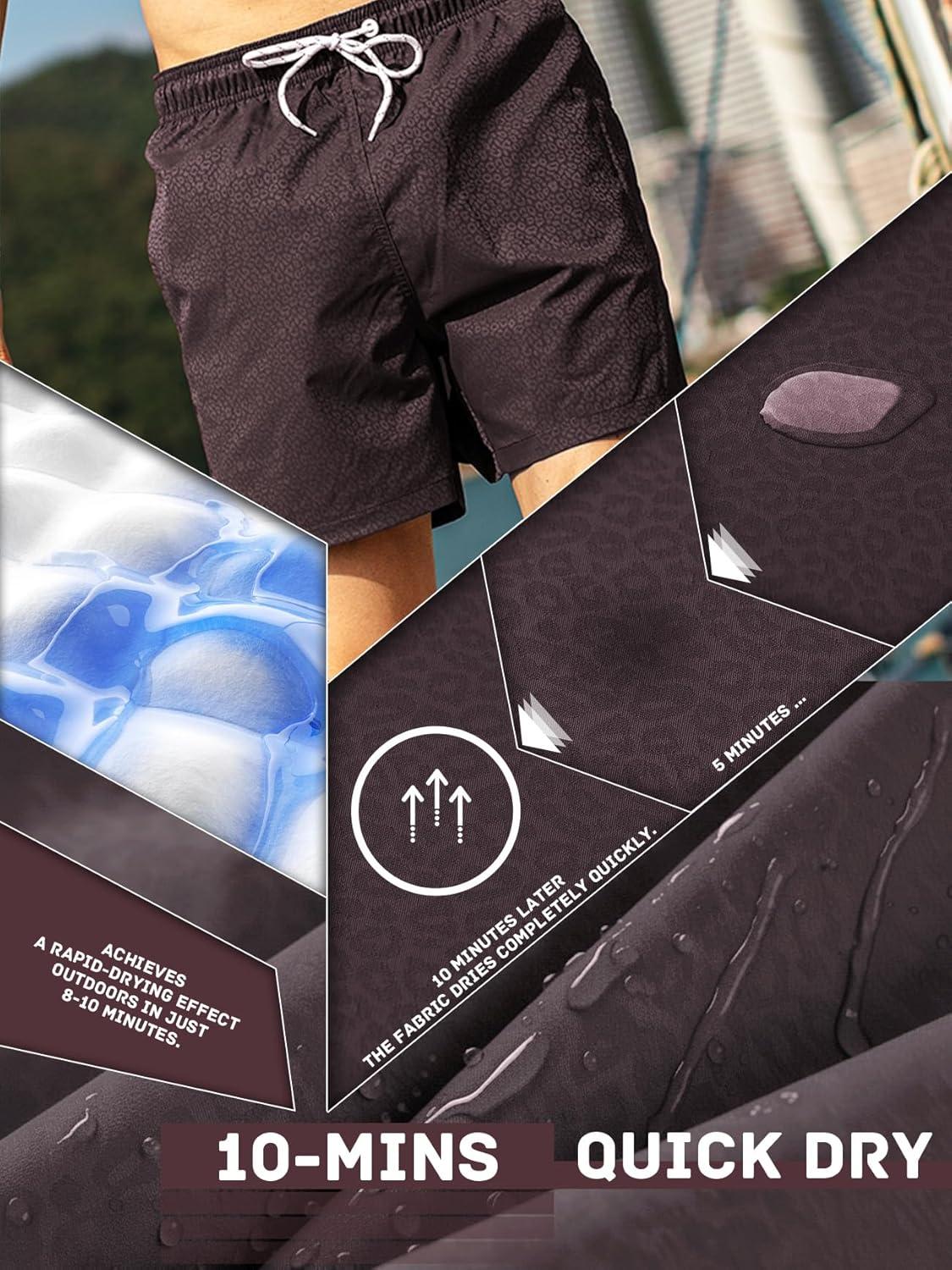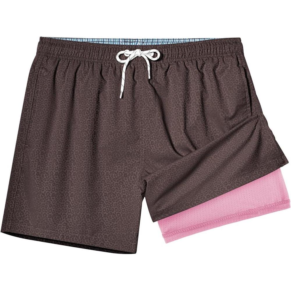 BRISIRA Mens Swim Trunks with Compression Liner 5″ Leopard Print Beach Shorts Quick Dry Board Shorts Water-Resistant Swimsuit(Brown Leopard)