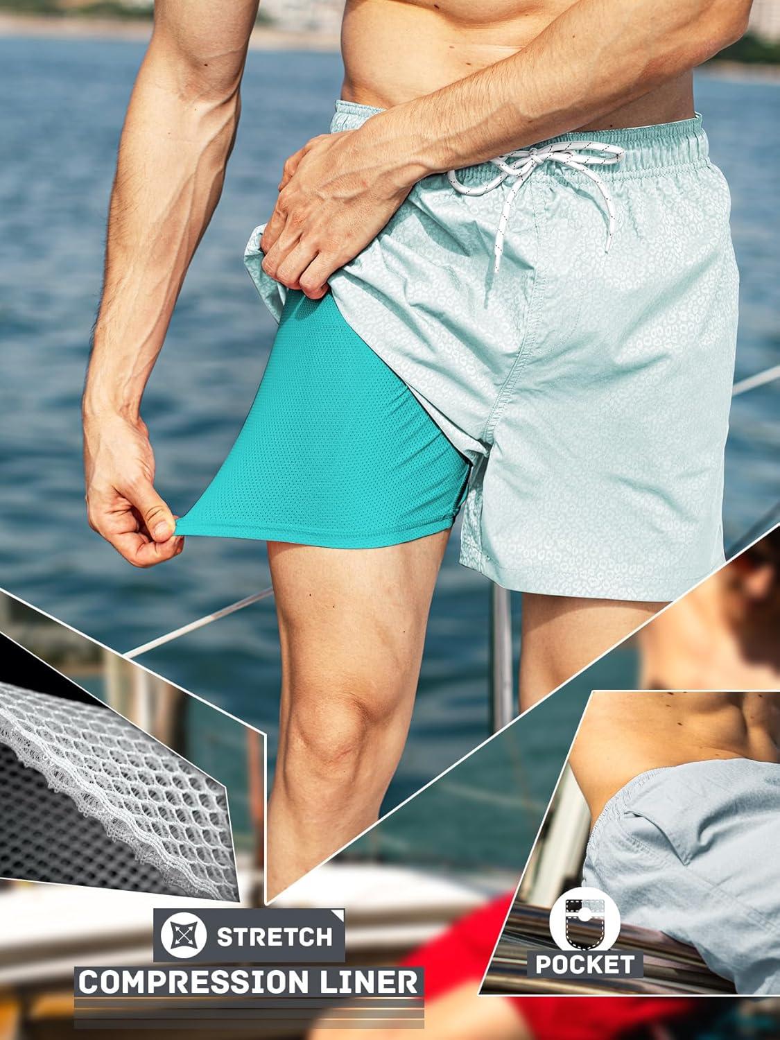 BRISIRA Mens Swim Trunks with Compression Liner 5″ Leopard Print Beach Shorts Quick Dry Board Shorts Water-Resistant Swimsuit(Lightblue Leopard)